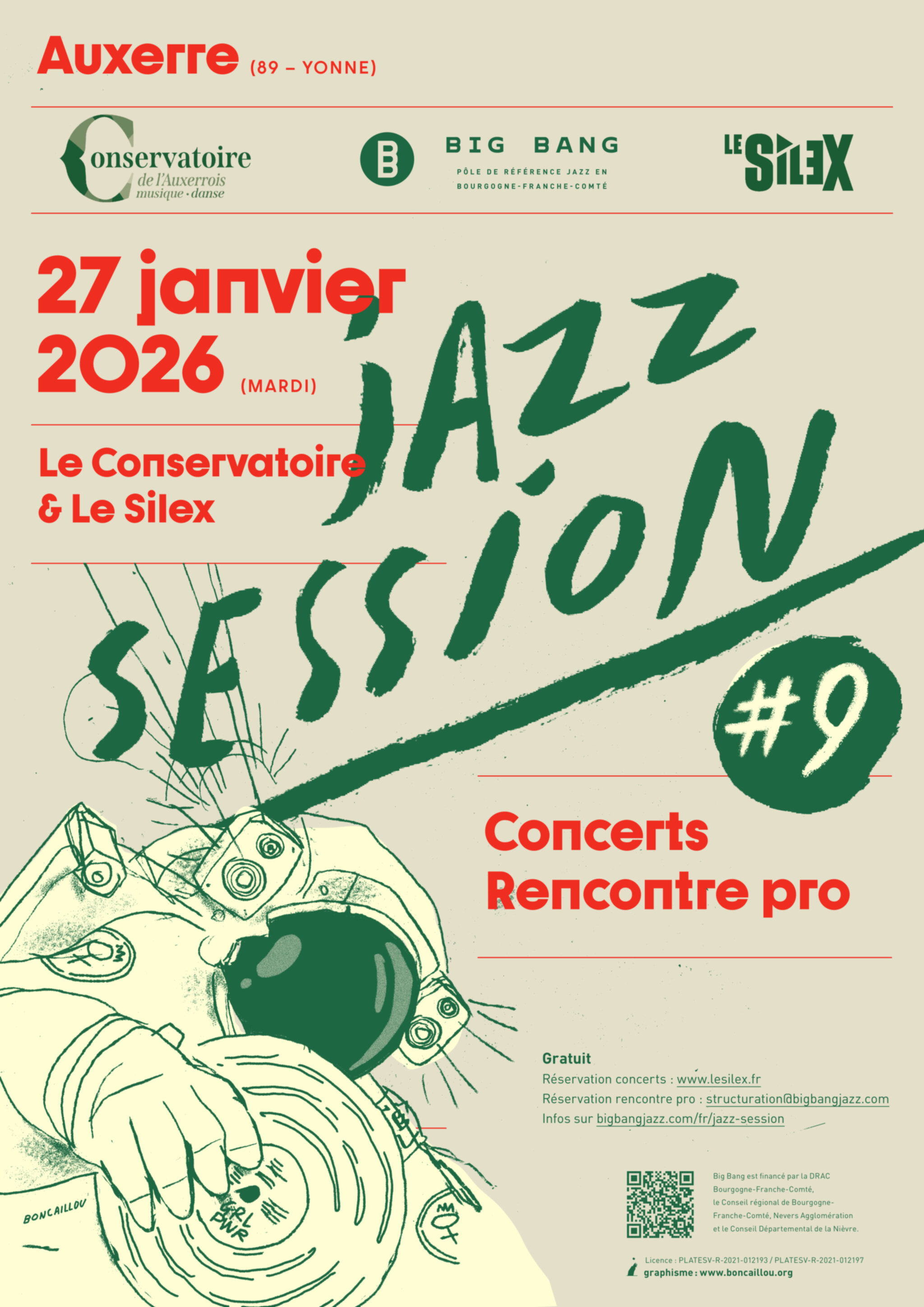 Chaque année, Big Bang s’associe à des partenaires d’une ville de Bourgogne-Franche-Comté pour co-organiser un ou plusieurs jours dédiés au jazz en région : Jazz Session.