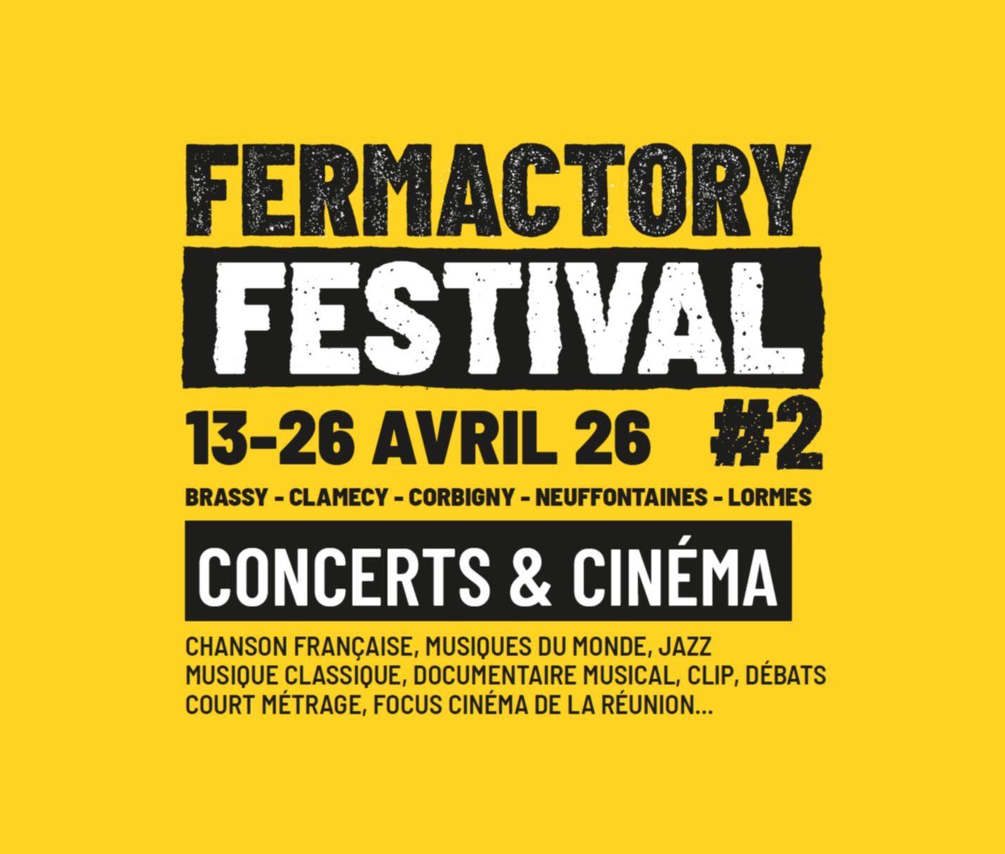 Au printemps, le Fermactory Festival se donne pour mission de faire dialoguer l’art, le patrimoine et les habitant qui peuplent ce territoire. Il se déploie en deux mouvements, deux respirations qui se répondent et s’enrichissent mutuellement. D’abord, le cinéma, avec des courts métrages, des documentaires et des longs métrages porteurs de sens, tandis que les réalisateurs et réalisatrices viennent à la rencontre du public. Puis vient le temps des concerts, ceux qui s’élèvent dans la Chapelle du Mont Sabot. Le temps d’un weekend, la musique y résonne différemment, qu’elle soit chanson française, jazz, classique ou venue d’ailleurs.