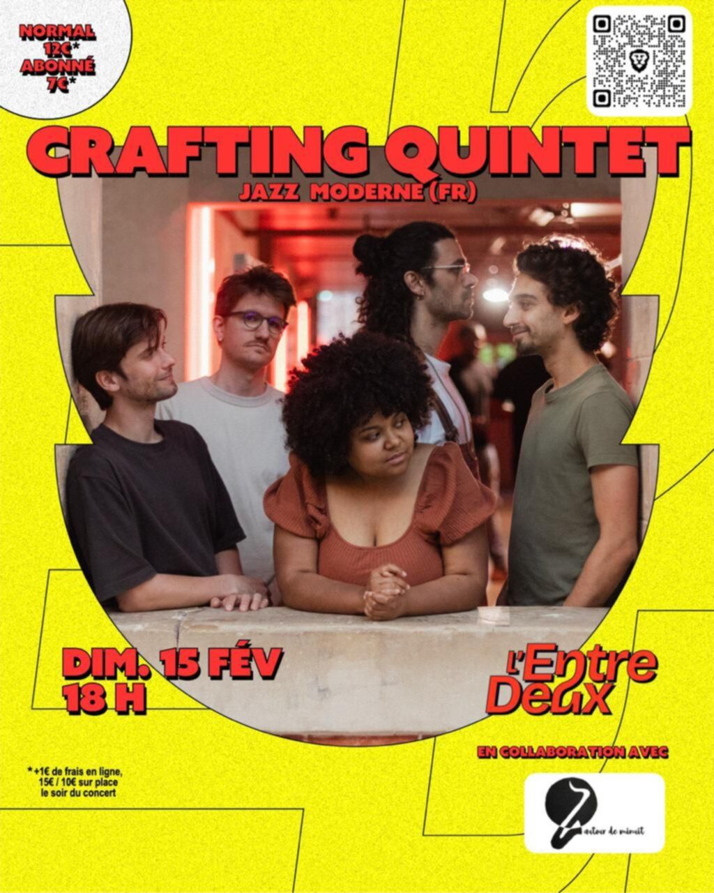 Crafting Quintet est un collectif de cinq musicien·ne·s et compositeur·ice·s, animé·e·s par la création (le "craft") d’un univers onirique qui invite à l’imagination. Avec le jurassien Renan Richard (saxophone) accompagné de Romain Habert (guitare), Clélya Abraham (piano), Yves Marcotte (contrebasse), Jean-Baptiste Loutte (batterie). Un concert proposé par la nouvelle association jurassienne "Autour de Minuit" en collaboration avec l'Entre-Deux.