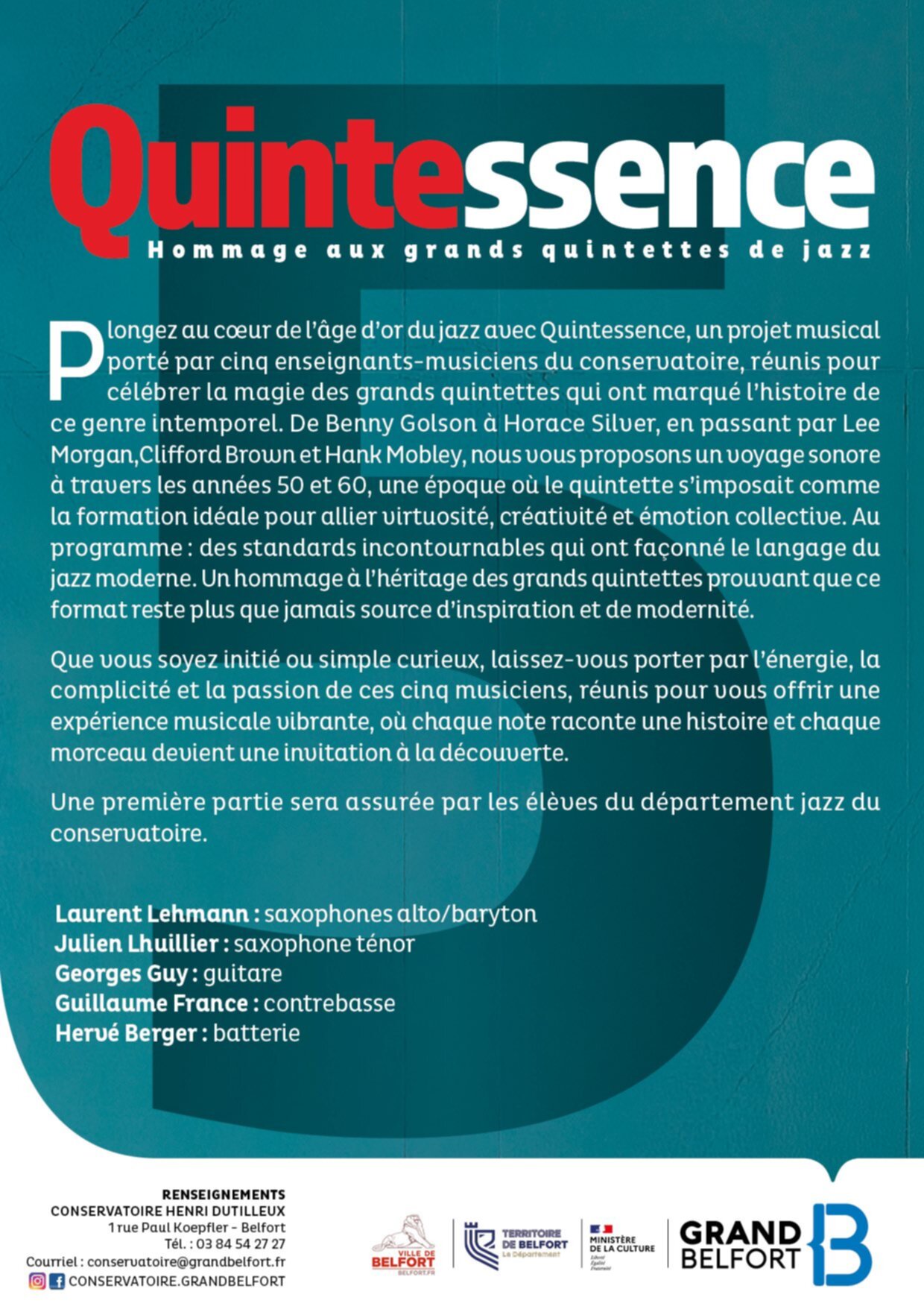 Plongez au coeur de l'âge d'or du jazz avec Quintessence, un projet musical porté par cinq enseignants-musiciens du conservatoire qui reprendront des standards incontournables, de Benny Golson, Horace Silver, Lee Morgan, Clifford Brown, Hank Mobley... La première partie sera assurée par les élèves du départements jazz du Conservatoire du Grand Belfort.