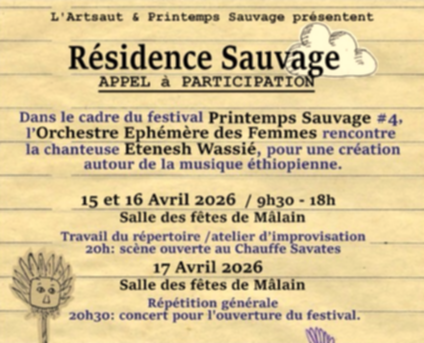 Dans le cadre du festival Printemps Sauvage, l'Orchestre Ephémère des Femmes rencontre la chanteuse Etenesh Wassié pour une création autour de la musique éthiopienne. Un stage organisé par l'Arsaut.